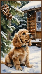 Теги: дома, ели, зима, снег, собаки, шишки