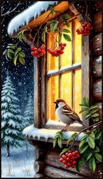Теги: дома, зима, окна, птицы, рябина, ягоды