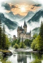 Теги: горы, деревья, замки, рисунок, солнце