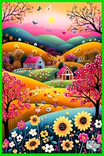 Теги: деревья, домики, куры, рисунок, цветы