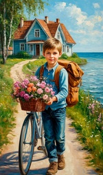Теги: велосипеды, дома, корзины, мальчики, цветы
