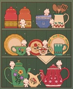 Теги: зайцы, полки, посуда, чайники, чашки