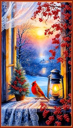 Теги: вечер, занавес, окна, осень, птицы, рябина, светильники
